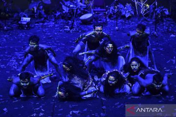 Penari Komunitas Selingkung Bumi mementaskan Tari Labubu pada pembukaan Jambi Cultural Fest 2025 di Taman Budaya Jambi, Jambi, Jumat (3/10/2025). Kegiatan yang digagas Asosiasi Koreografer Jambi dan didukung Dinas Kebudayaan dan Pariwisata Provinsi Jambi tersebut bertujuan sebagai medium kampanye penyelamatan lingkungan dan ekosistem hutan yang digelar 3-5 Oktober 2025 dengan menampilkan empat koreografer asal Jambi, Sumatera Barat, Aceh, dan Lampung. ANTARA FOTO/Wahdi Septiawan/YU