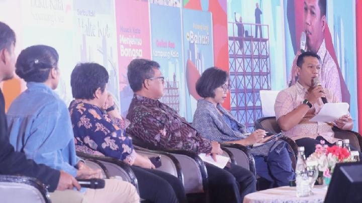 (Kanan) Peneliti Sekolah Kajian Strategik dan Global (SKSG) Universitas Indonesia Nalendro Nusantoro saat diskusi buku “Tak Tidur Berpendar Cahaya” dalam peluncuran “Buku Tematik Berbasis Riset, Menyongsong 500 Tahun Jakarta” di Hotel Millenium, Jakarta, pada Kamis, 18 Desember 2025. TEMPO/Lourentius EP