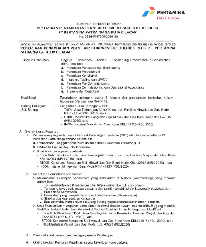 INFO TEMPO – PT Pertamina Patra Niaga Refinery Unit (RU) IV Cilacap membuka tender terbuka untuk pekerjaan Penambahan Plant Air Compressor Utilities Residual Fluid Catalytic Cracking (RFCC). Kesempatan ini terbuka bagi calon peserta pemilihan yang berstatus Daftar Penyedia Terseleksi (DPT)/Vendor terdaftar di lingkungan Pertamina maupun vendor non-DPT yang belum terdaftar dalam sistem perusahaan.