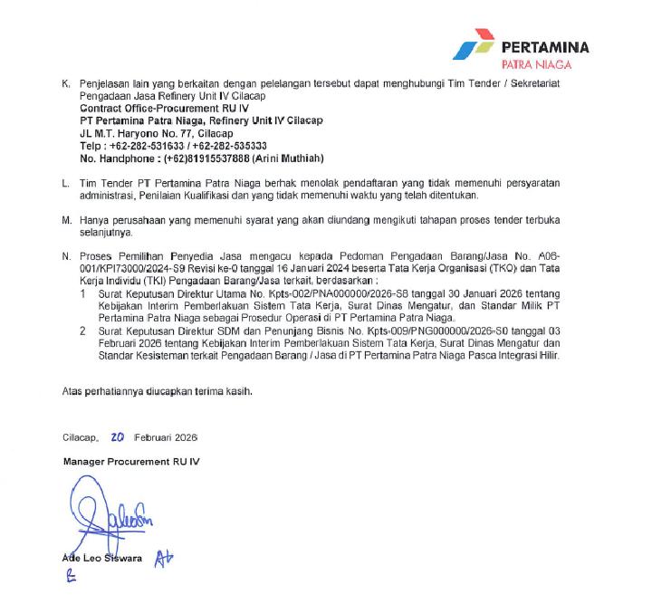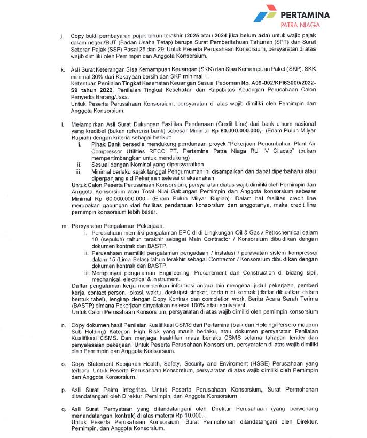 Adapun dokumen tender terbuka secara lengkap dapat dilihat dan diunduh disini. Tender ini diharapkan dapat menjaring mitra kerja profesional dan kompeten guna mendukung peningkatan keandalan fasilitas utilities RFCC di RU IV Cilacap.