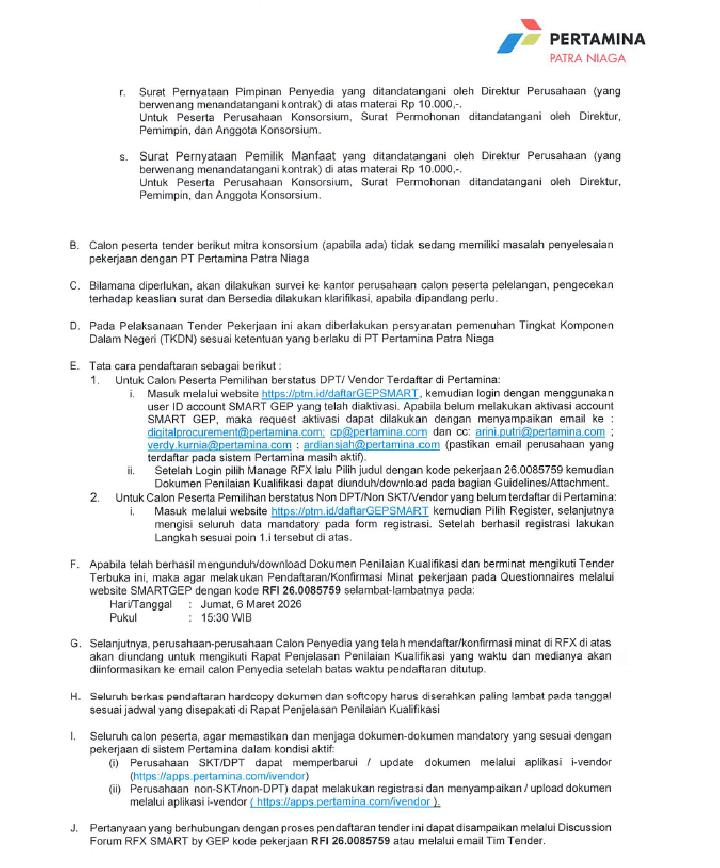 Peserta juga diminta memastikan bahwa alamat email perusahaan yang terdaftar pada sistem Pertamina masih aktif guna kelancaran komunikasi dan notifikasi proses tender.